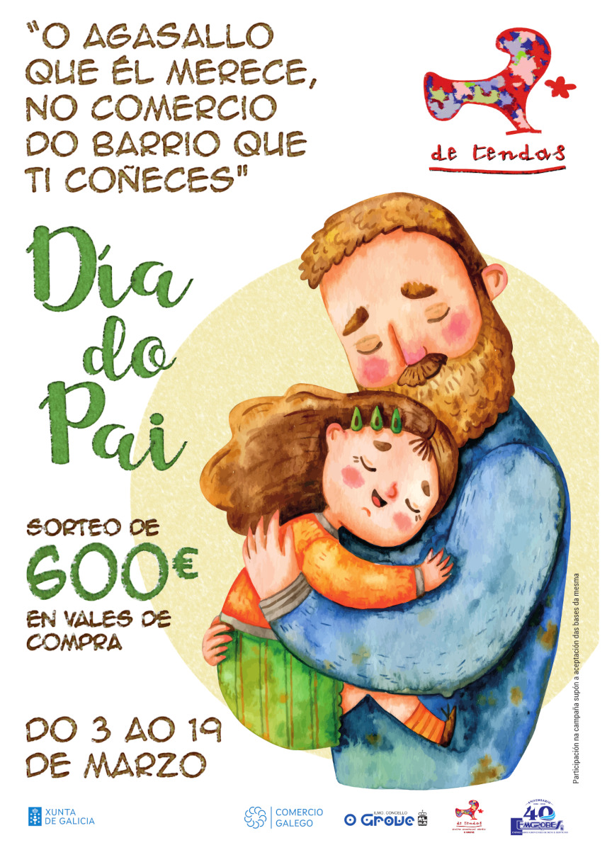 EMGROBES realizará, pola campaña do día do Pai, o sorteo de 8 premios consistentes en vales de compra, 1 de 150 €, 2 de 100 € e 5 de 50 € . Total valor dos premios de 600 euros en vales de compra entre os clientes do que participen na campaña mercando nos establecementos do CCa de tendas e cubran os tiquets, albaráns ou facturas de compra co seu nome e apelidos e teléfono de contacto. Adicionalmente farase un sorteo nas RRSS de Emgrobes de 100€ en vales de compra.